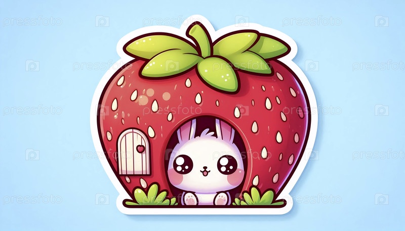 Милый стикер кавайи с кроликом в клубничном доме, Ai generated image