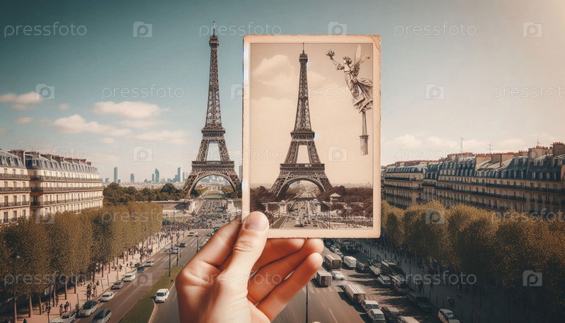 Then-and-now concept: ретро открытка против современной Эйфелевой башни, Ai generated image
