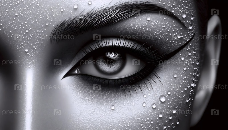 Экстремальный портрет красоты на близком расстоянии, фокусирующийся на глазу с помощью геометрического жидкого лайнера для глаз и капель росы, Ai generated image