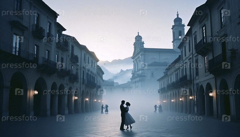 Пара, медленно танцующая посреди асфальтированной площади в небольшом европейском городке, совершенно одна на рассвете, Ai создала изображение