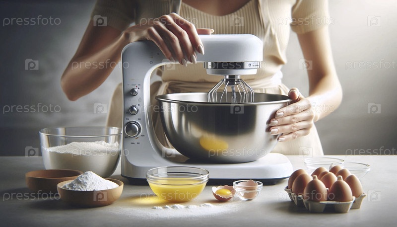 Близкий снимок сверху вниз рук женщины, использующей новый электрический миксер в искрящейся желтой тарелке с ингредиентами, идеально предварительно измеренных в стеклянных чашках