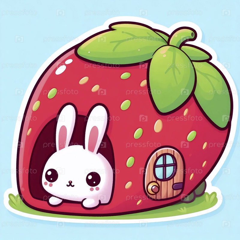 Милый стикер кавайи с кроликом в клубничном доме, Ai generated image