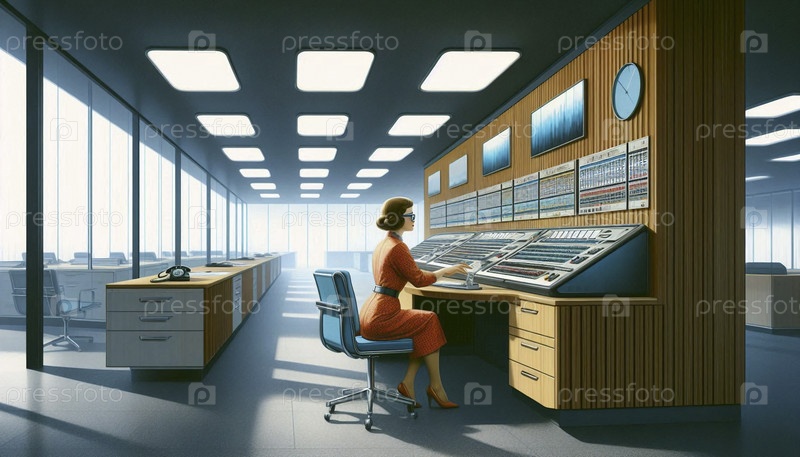 Просторный, минималистичный офис, где секретарша управляет большой футуристической компьютерной консолью с множеством кнопок и огней, Ai создал изображение