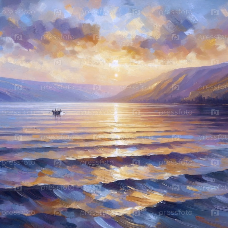 Галилейское море в золотое время, импрессионистский стиль, Ai generated image
