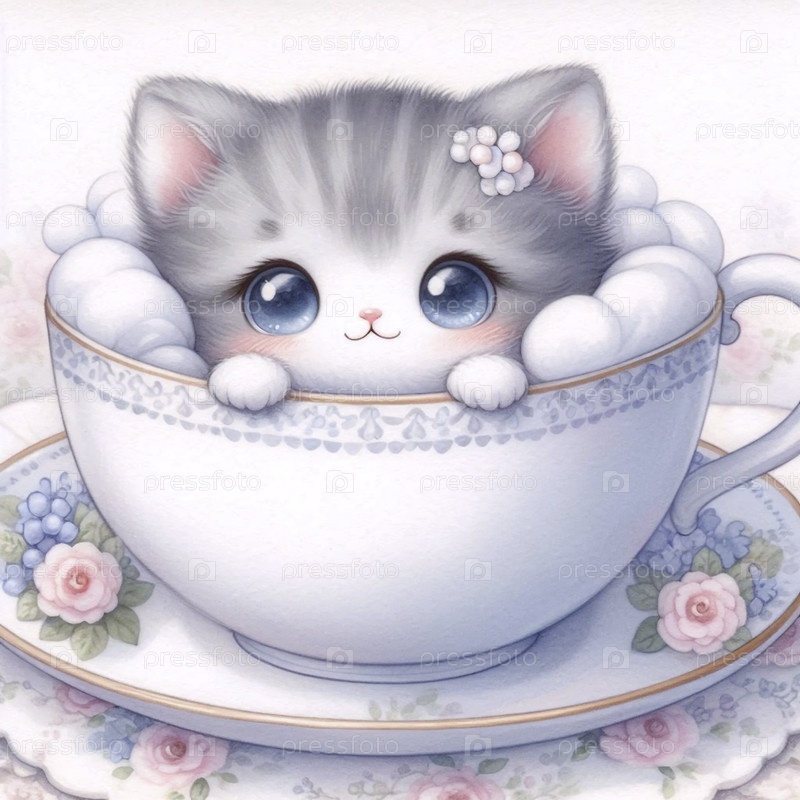 Кавайская сцена кошки в чайной чашке, Ai generated image