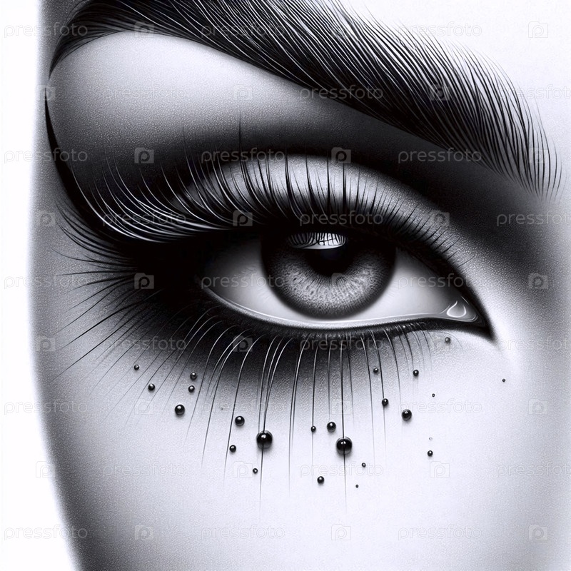 Экстремальный портрет красоты на близком расстоянии, фокусирующийся на глазу с помощью геометрического жидкого лайнера для глаз и капель росы, Ai generated image