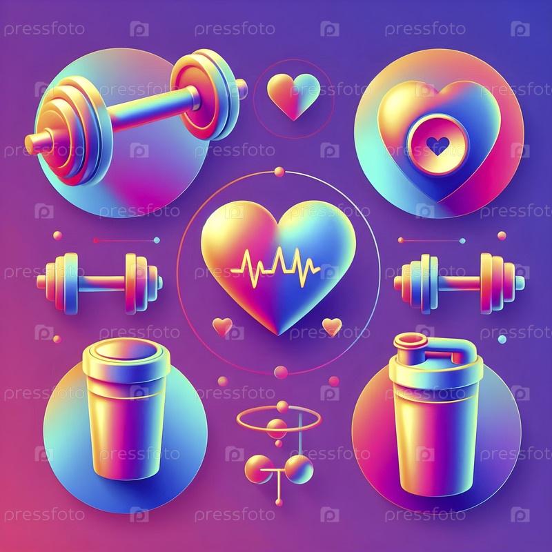 Плавучие фитнес-иконы, гантели, частота сердечных сокращений, протеиновый шейк, Ai created image