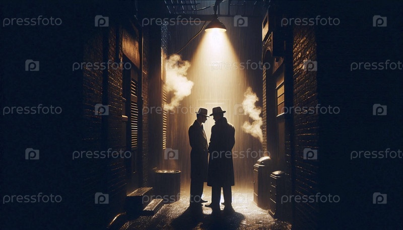 Секретный разговор между двумя мужчинами в шляпах, их лица скрыты под тентом мокрой аллеи, создал изображение Ай