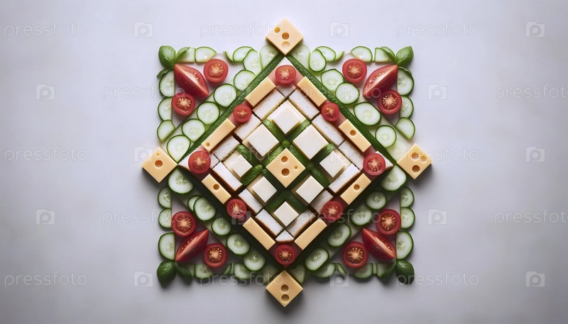 Геометрическая пищевая художественная композиция с точно разрезанными бутербродами, кубиками сыра и фрагментами овощей, Ai created image