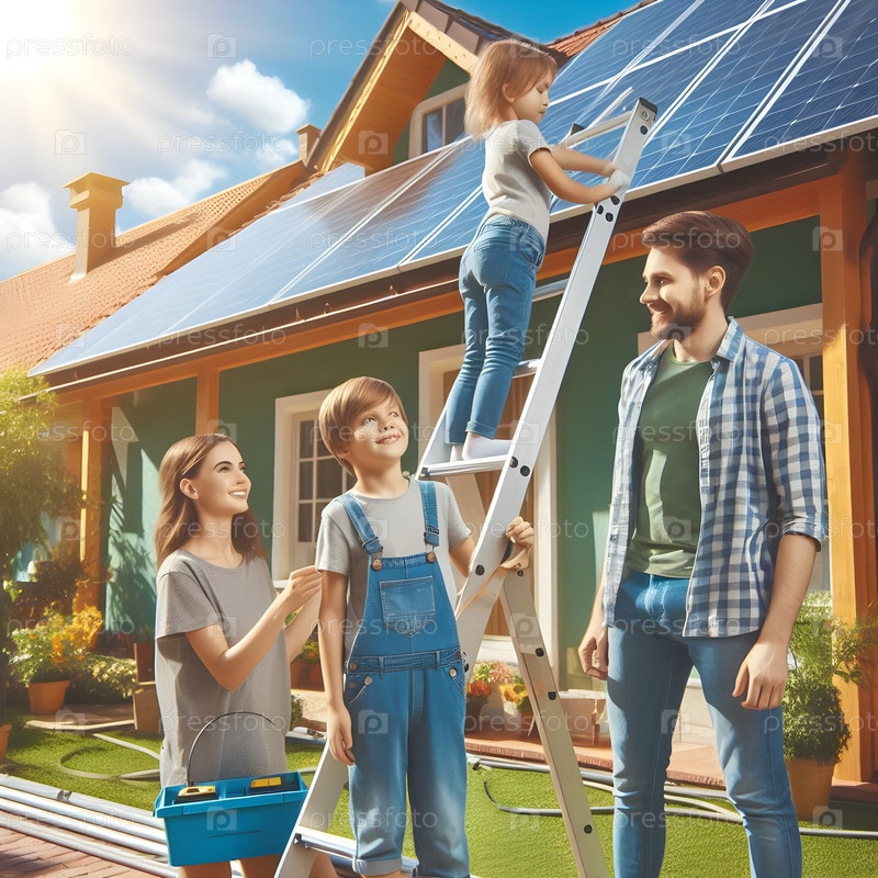 Семья устанавливает солнечные батареи в свой экологически чистый дом, солнечный день