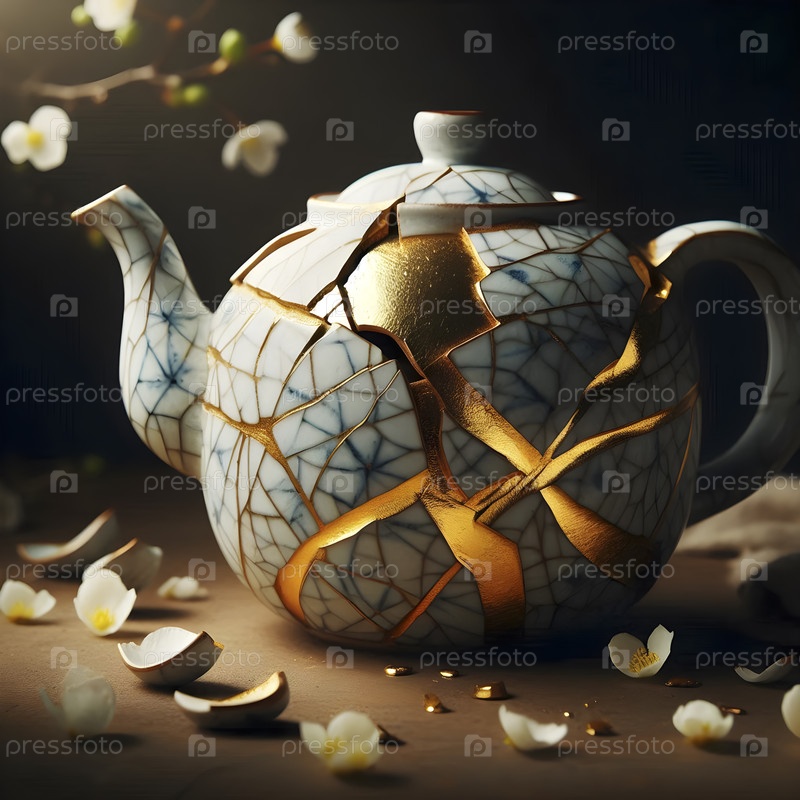 Сломанный чайник kintsugi-repaired with gold, Аи created image