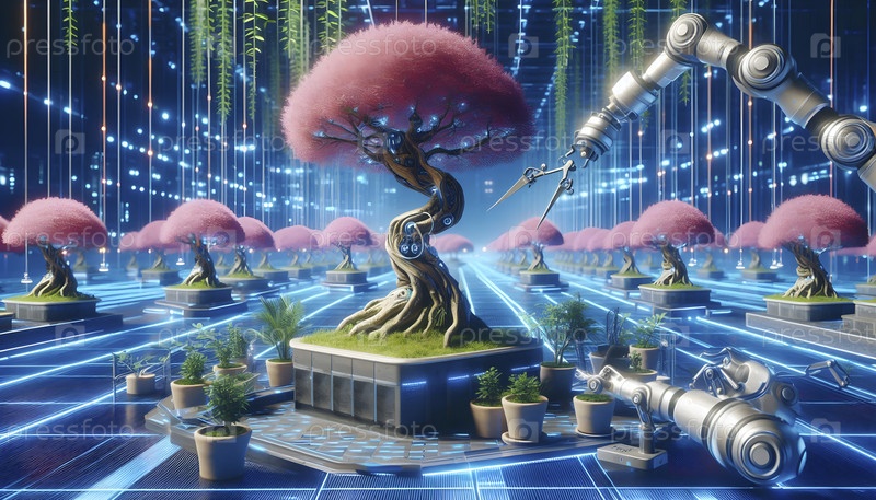 Футуристический сад, где роботизированные руки обрезают деревья бонсай, Ai created image