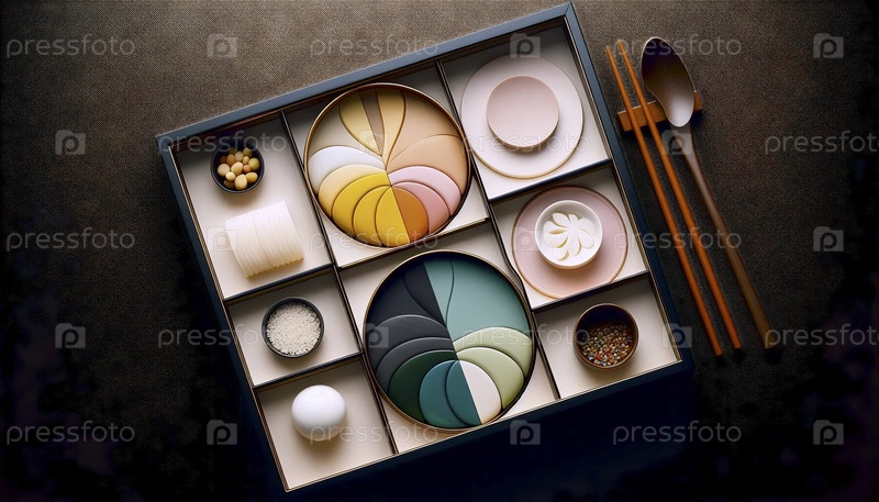 Минималистическое японское кулинарное искусство washoku с точно расположенными пятицветными компонентами в лаковой коробке, Ai created image