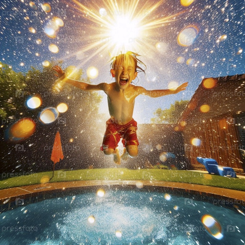 Ребенок посередине прыгает в ярко-синий надувной бассейн, огромное количество капель воды замерзло в воздухе, Ai создал изображение