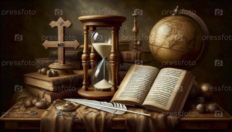 Натурм с песочными часами, крестом и открытой книгой Ai generated image