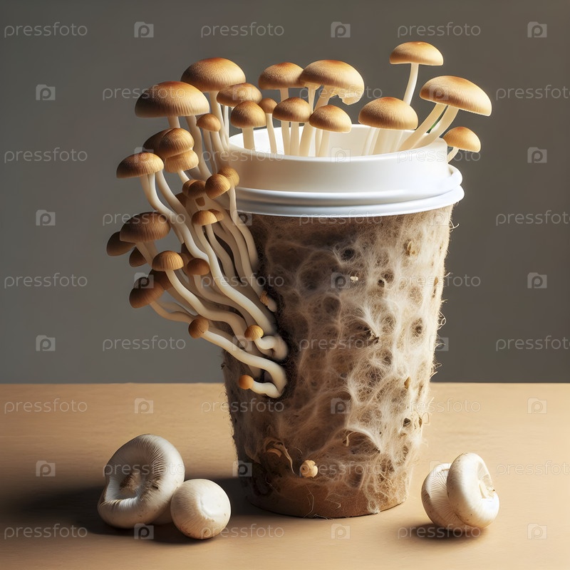 Кофейная чашка, выращенная из мицелии с биоразлагаемой подкладкой, Ai created image