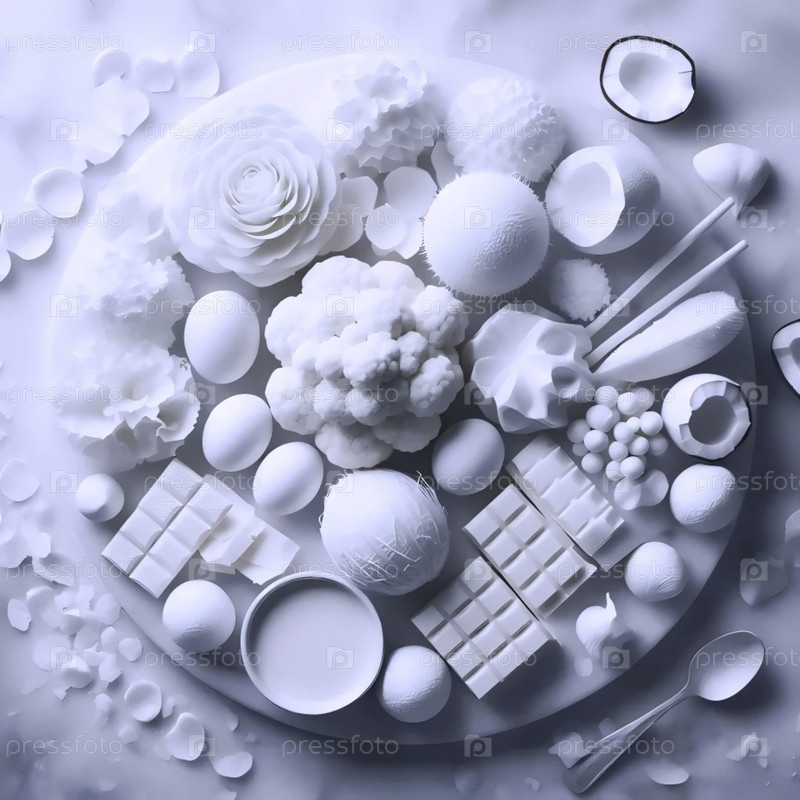 Монохроматическая пищевая художественная композиция с использованием только белых ингредиентов цветной капусты, кокосового ореха, белого шоколада, Ai created image