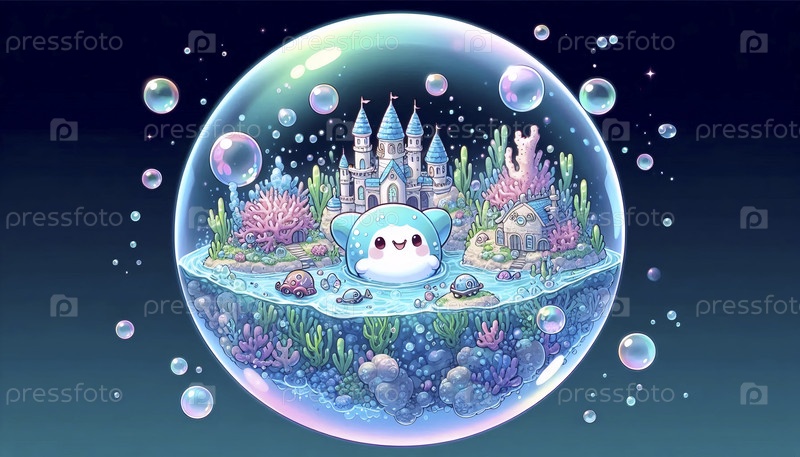 Подробная иллюстрация кавайи подводного города в пузыре, Ai generated image
