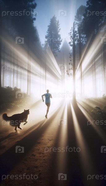 Женщина, бегущая со своей собакой по лесной тропе, окутанной густым эфирным утренним туманом с лучами солнца, фильтрующимися через навес