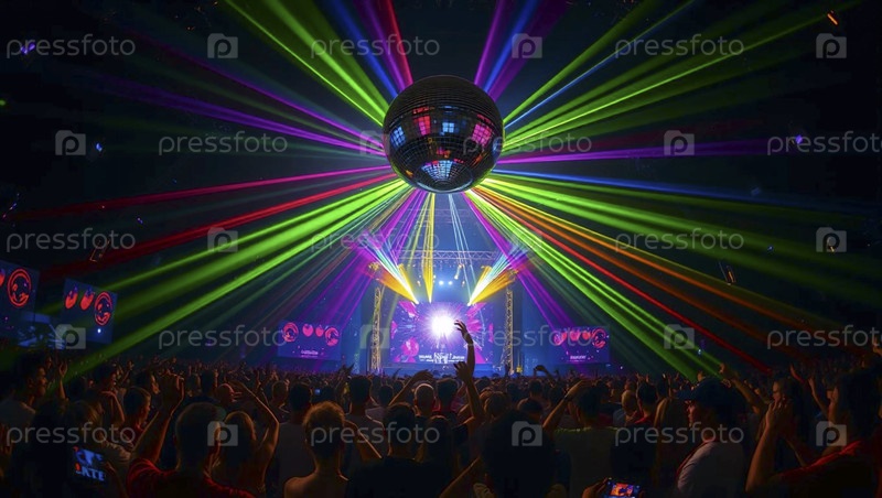 Сцена в ночном клубе с одним гигантским дискотечным шаром, отражающим красочные лазерные лучи во всех направлениях, Ai generated image