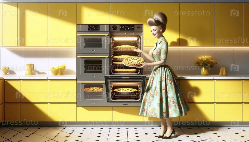 Безупречная кухня 1960-х годов с лимонно-желтыми приборами, улыбающаяся домохозяйка, кладящая пирог в современную духовку, Ai generated image