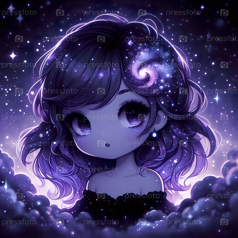 Подробная иллюстрация девушки-кавайи, которая является живым ночным небом, Ai generated image