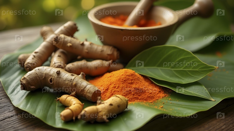Свежие корни куркумы, ашваганда и листья брахми, изображение создано искусственным интеллектом