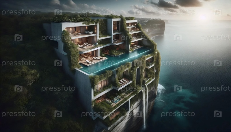 Убежище на обрыве с живыми стенами, Ai generated image