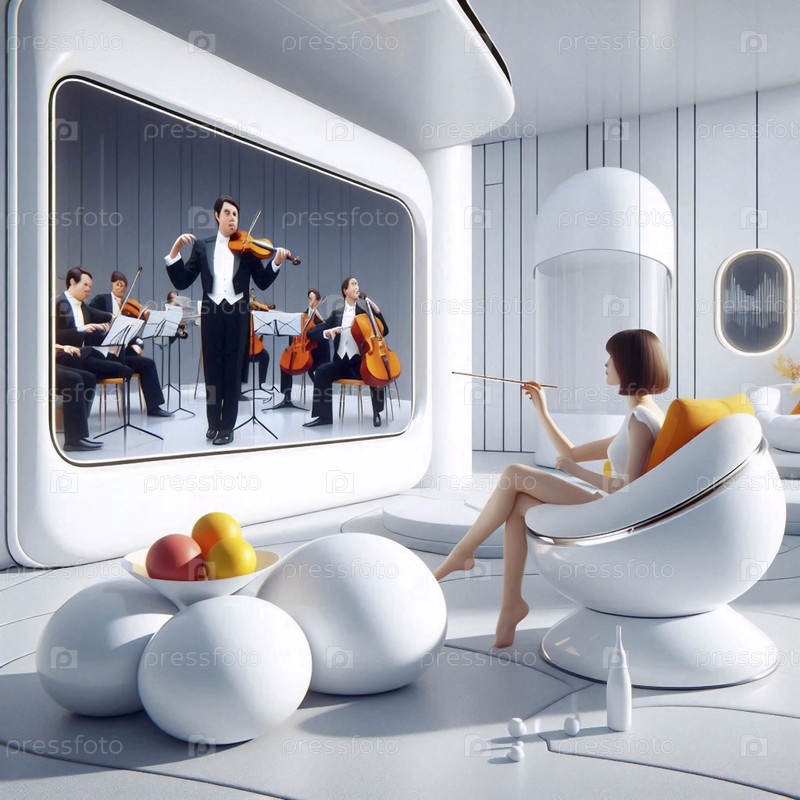 Футуристическая гостиная Home of Tomorrow с прозрачной пластиковой мебелью и женщиной, дирижирующей оркестром на большом экране телевизора