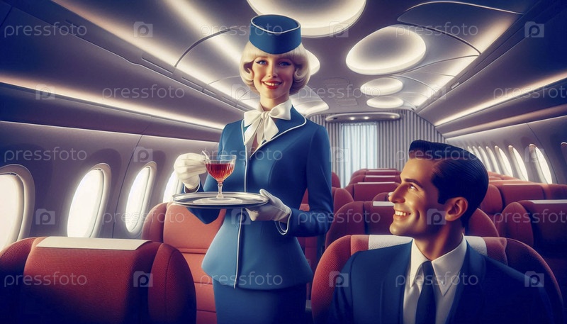 Гламурная стюардесса предлагает бизнесмену коктейль в просторной ретро-футуристической кабине самолета, Ai generated image