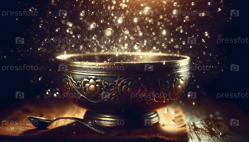 Тибетская певческая чаша, вибрирующая капельками воды, Ai created image