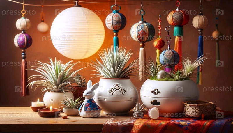 Интерьер в стиле бохо, стеклянные террариумы с воздушными растениями Tillandsia и увлажнителем, Ai generated image