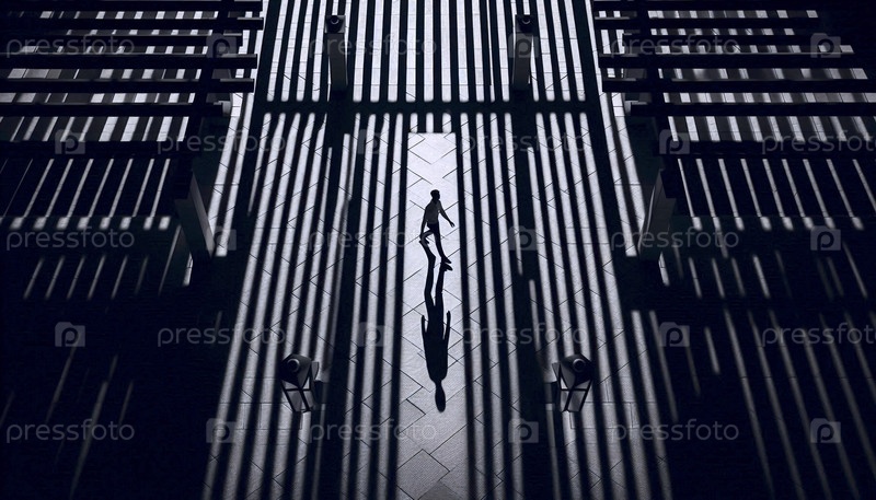 Одинокая фигура в шляпе с широкими краями, идущая по коридору ярких, повторяющихся теней из перголы, Ай создала образ
