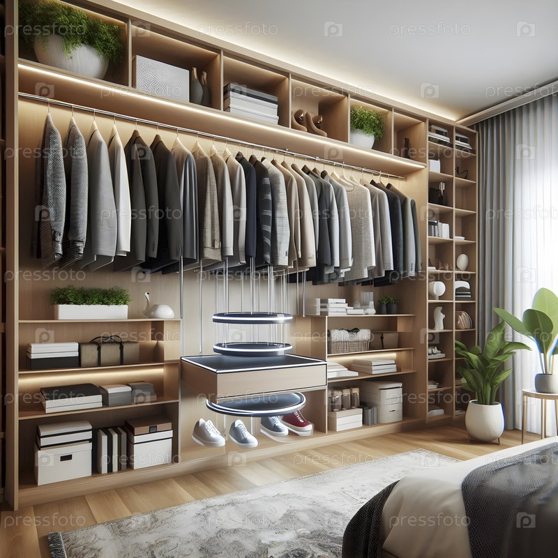 Умный шкаф, организующий одежду с помощью левитирующих вешалок, Ai created image