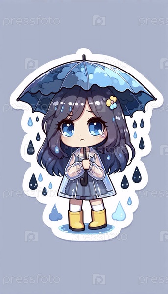 Красивый стикер kawaii с девушкой в дождливые дни, Ai generated image
