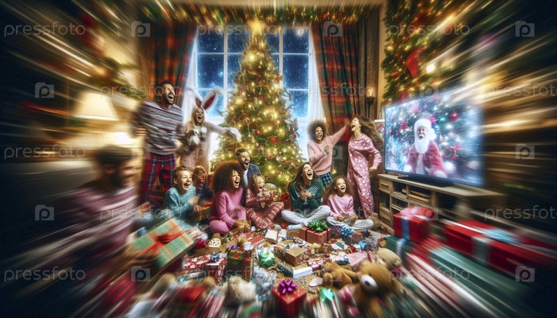 Семья собралась вокруг нового телевизора-консоли в рождественское утро, повсюду обертывая бумагу