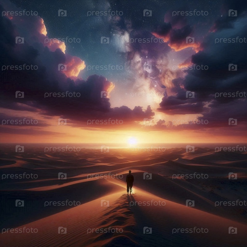 Одинокий путешественник, сидящий на капоте старинного Land Rover и размышляющий о бесконечной пустыне под звездное сумеречное небо