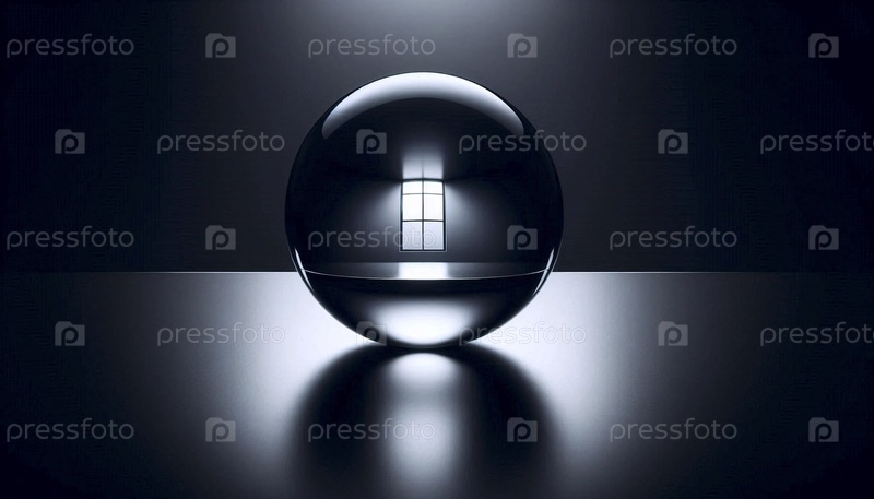Совершенно сферическая капля воды на черной анодированной металлической поверхности, отражающая искаженную раму окна, Ai создала изображение