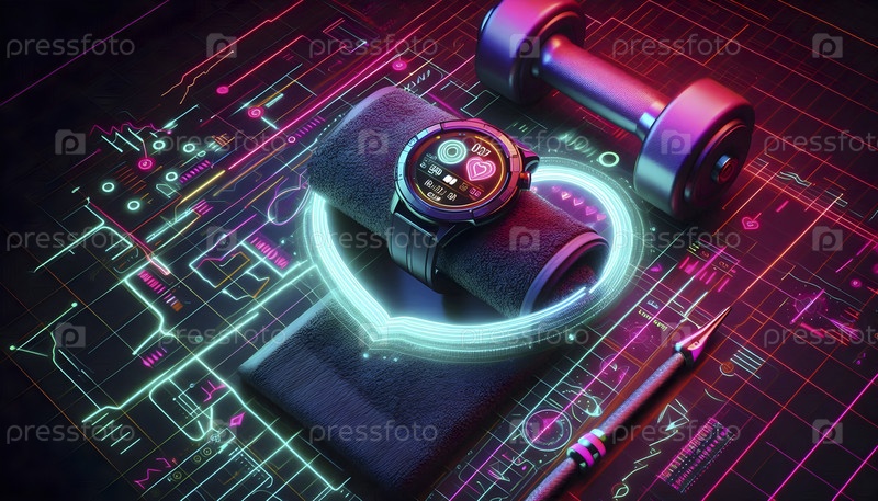 Неоновые композиции: умные часы, показывающие данные о частоте сердечных сокращений, Ai created image