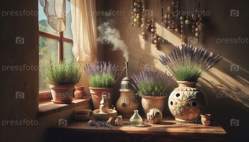 Интерьер в стиле бохо, стеклянные террариумы с воздушными растениями Tillandsia и увлажнителем, Ai generated image