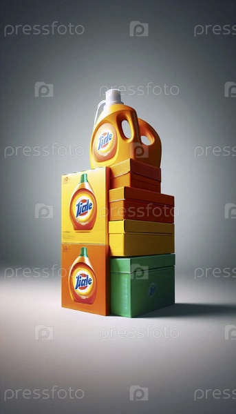 Смелая, графическая натюрмортная картина высокой кучи ярко окрашенных коробок с стиральным detergent на чистом белом фоне, Ai generated image