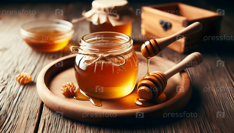 Банка с медом с деревянной крышкой, изображение создано AI