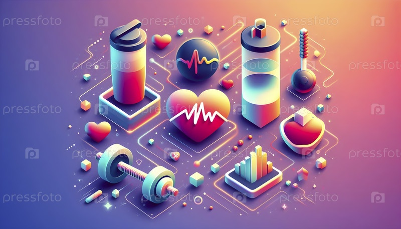 Плавучие фитнес-иконы, гантели, частота сердечных сокращений, протеиновый шейк, Ai created image