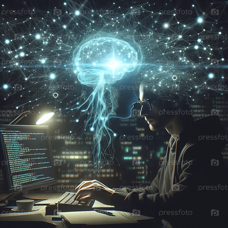 Программист вводит код с светящейся визуализацией нейронной сети на заднем плане, темная тема, цифровое искусство