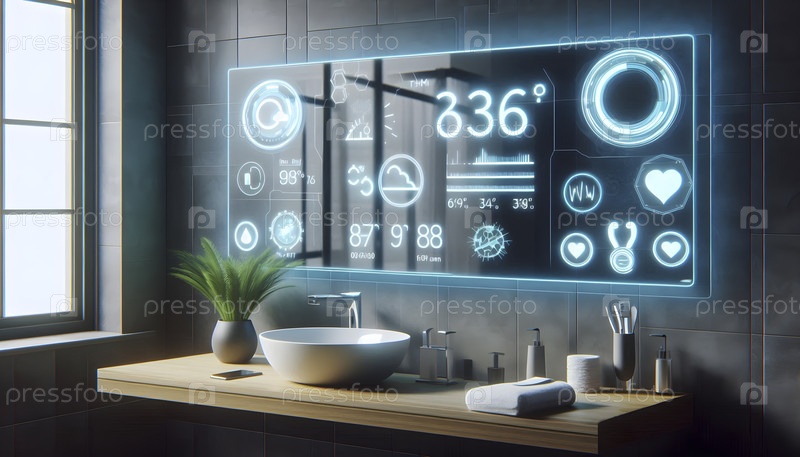 Зеркало ванной комнаты, отображающее данные о погоде и статистику здоровья, Ai created image