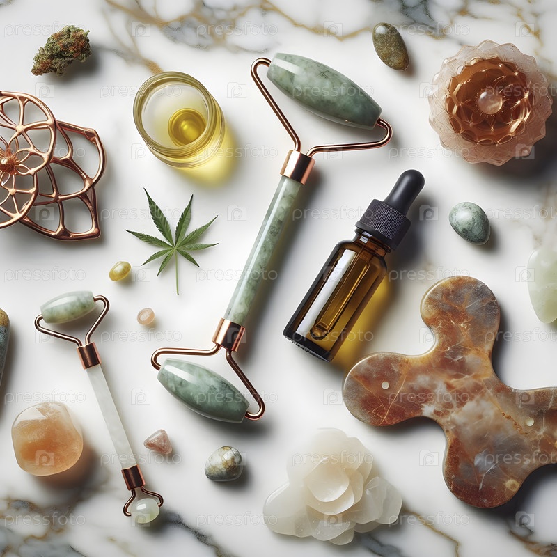 Аэрофотосъемка инструментов восстановления: медный гуа-ша, ролик из нефрита и капли CBD масла, Ai created image