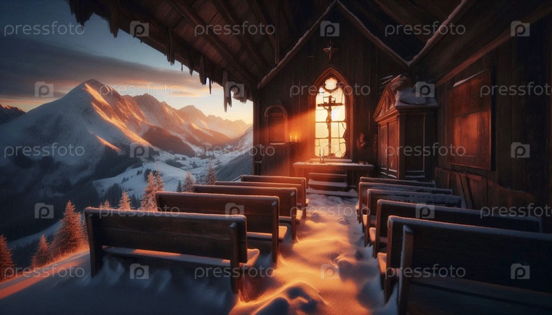 Заброшенная горная часовня на восходе солнца, Ai generated image