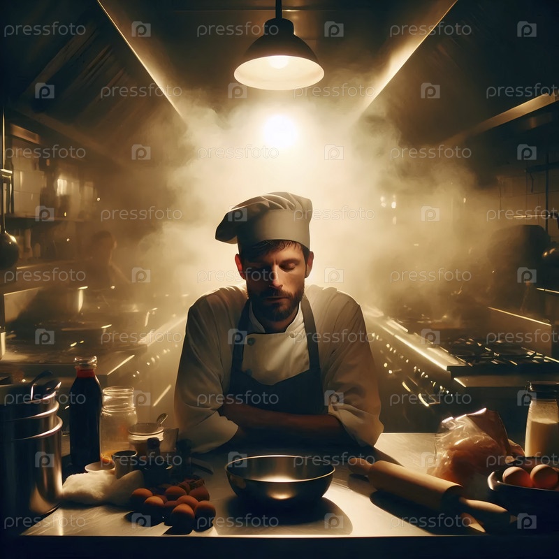 Шеф-повар в тихом, сфокусированном послеобеденном сервизе, убирающий станцию на кухне, освещенной только практическими рабочими огнями, Ай создал изображение