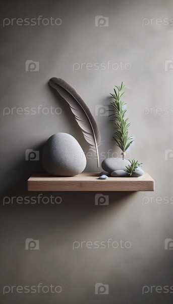 Рустичная полка с камнем, перьями и веточкой розмарина Ai создала изображение
