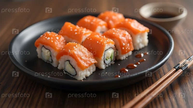 Суши-ролл на черной тарелке, изображение создано с помощью ИИ